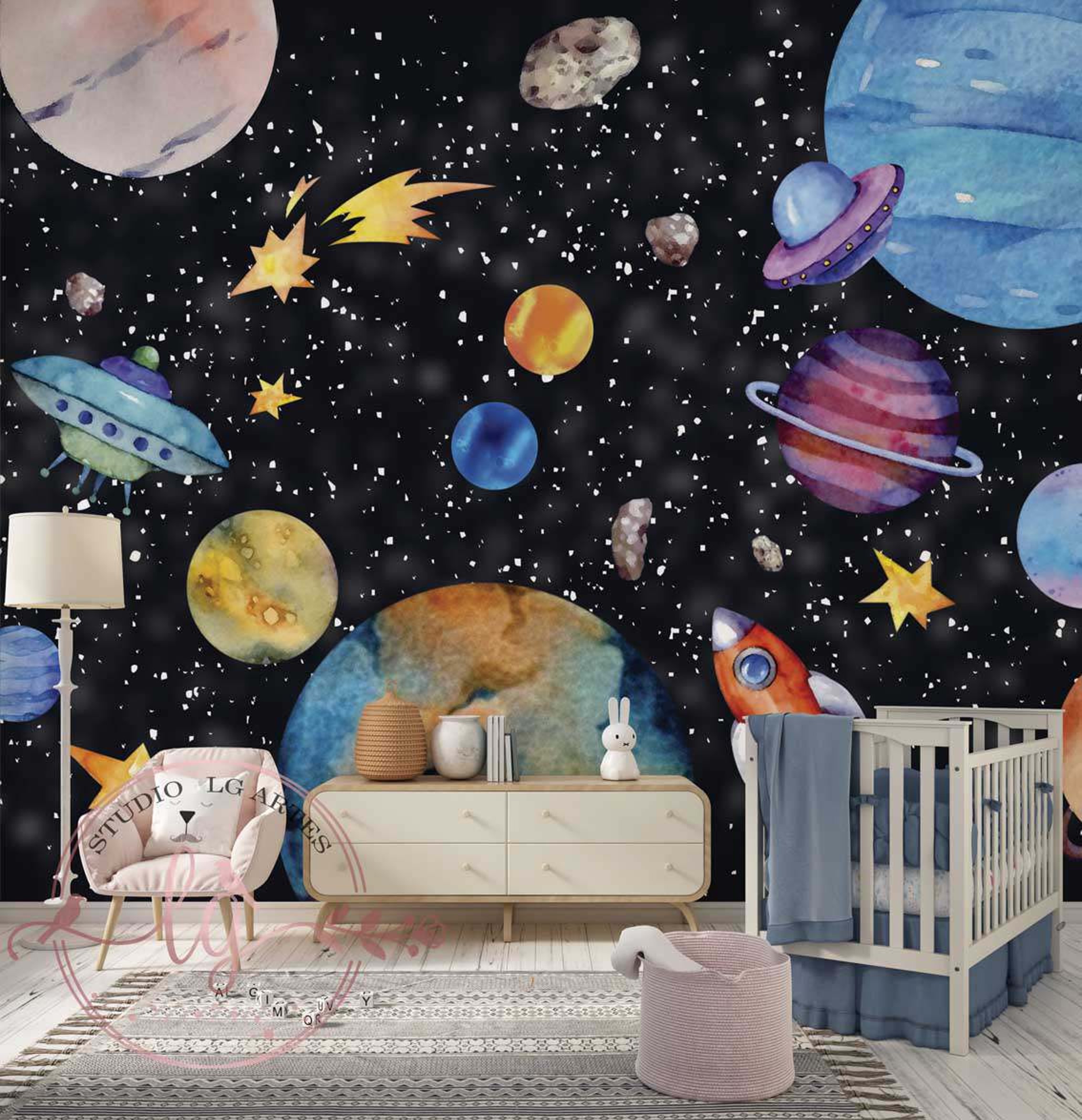 Papel de Parede Infantil Astronauta e Universo – Adesivo de Constelações, Planetas e Foguetes